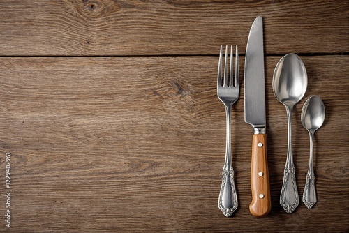 Silver cutlery set with wooden-handled knife placed neatly on wooden background. Rustic style, ideal for dining or kitchen design concepts. Ai generative