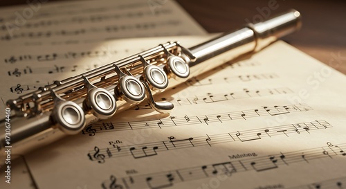 flute, silver, music, sheet music, musical notes, instrument, classical music, orchestra, melody, harmony, composition, still life, photo, closeup, detail, antique, vintage, aged, warm light, soft light, shadow, texture, metallic, shiny, elegant, graceful, peaceful, serene, contemplative, inspiration, artistry, musical, art, beauty, craftsmanship, precision, key, hole, musical score, score, note, rythm, tempo, concert, performance