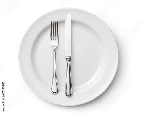 plate, fork, knife, silverware, table, dining, eat, meal, eatery, white, clean, empty, isolated, top, view, utensil, metal, steel, setting, dinner, lunch, food, service, cutlery, object, shiny, gloss, polished, presentation, kitchen, cookery, background, simple, elegant, formal, ready, single, shadow, circular, round, ceramic, porcelain, plain, nobody, overhead, arrangement, flatware, immaculate, pristine