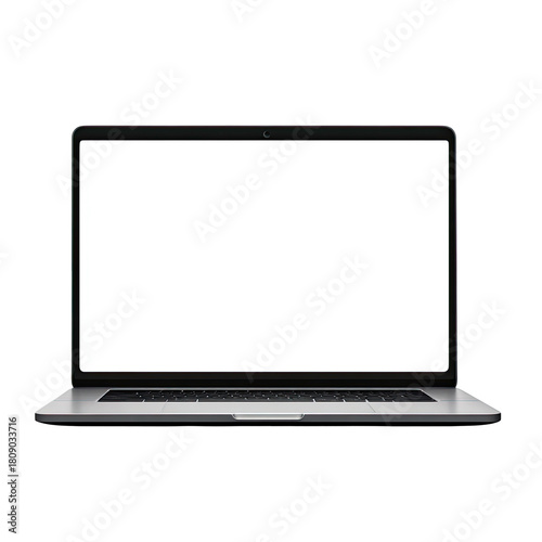 Silver laptop with a blank white screen on transparent background