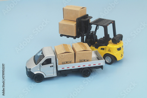 Silver lorry truck with cardboard boxes and forklift truck on blue background. Shipping, delivery, cargo, moving and freight transportation concept.