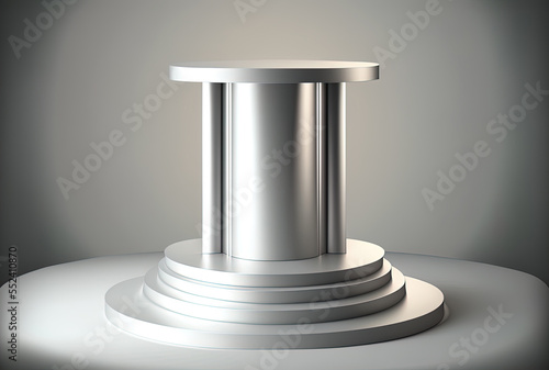Silver luxury podium with an abstract backdrop and an empty pedestal for product placement. Generative AI