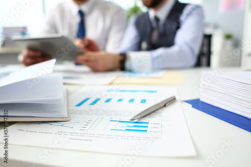 Silver pen lie on important paper at table with group of colleagues in background closeup. Paperwork job trade balance bank credit loan money invest payment irs commerce partnership concept