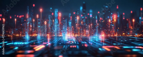 Silver tray holding a futuristic digital city, glowing arrows ascending, neon cityscape, cyberpunk technology, vibrant future