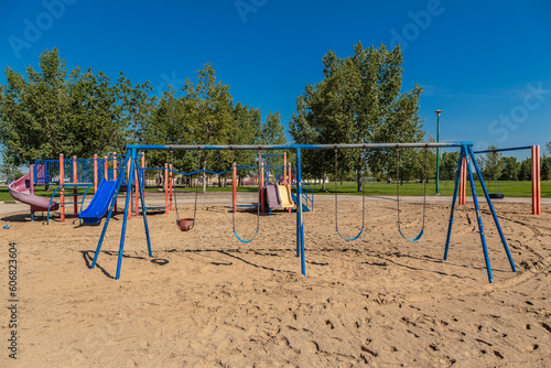 colourful, day, empty, equipment, foliage, fun, grass, green, landscape, lawn, nature, outside, park, path, plastic, play, playground, recreation, tree