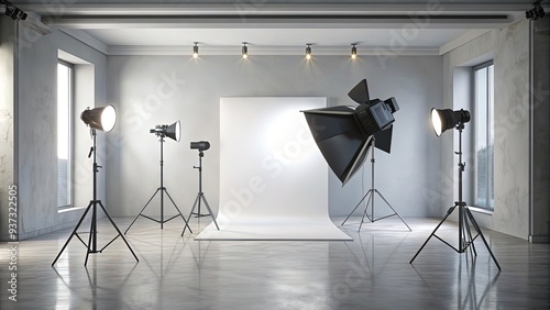 Simple and elegant white studio backdrop, softbox lights, and a professional camera on a tripod, set against a clean and minimalist atmosphere.