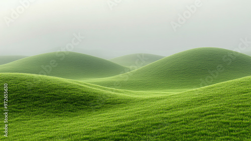 Simple and serene rolling green hills under a foggy sky, showcasing the beauty of minimalistic landscape with tranquility and calmness.