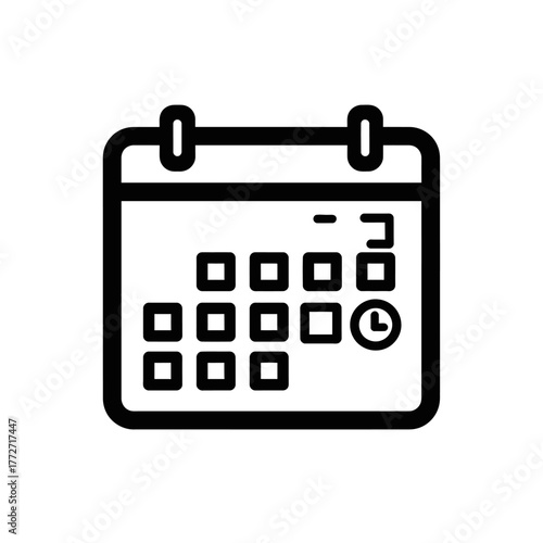 Simple Black and White Calendar Icon with Clock Symbol for Scheduling.