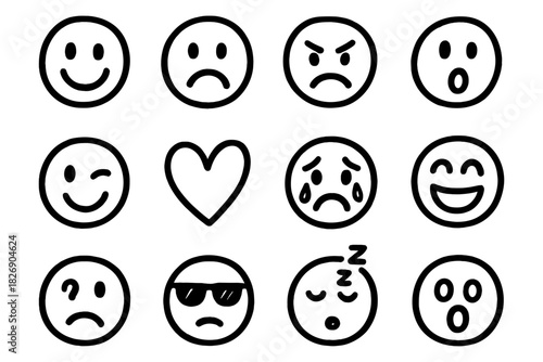 emoticon, simple, black, white, line, facial, expression, emotion, set, smiley, sad, happy, angry, surprised, wink, nubes, cry, laugh, cool, sleepy, shocked, minimalist, cute, cartoon, face, outline, mood, feeling, symbol, design, doodle, graphic, vignetting, artistic, digital, fun