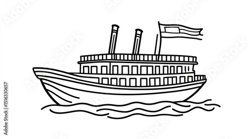 line, drawing, black, white, riverboat, vintage, ship, steamboat, illustration, outline, graphic, nautical, vessel, water, wave, boat, vignetting, simple, classic, detail, design, flat, style, old, travel, cruise, passenger, transport, steam, engine, deck, cabin, window, smokestack, flag, profile, side, silhouette, vector