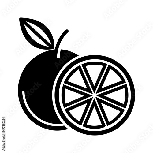 orange, fruit, icon, graphic, design, black, white, simple, minimal, vector, illustration, citrous, food, sliced, half, leaf, healthy, vitamin, fresh, organic, round, symbol, logotype, element, clip art, silhouette, monochrome, isolated, ripe