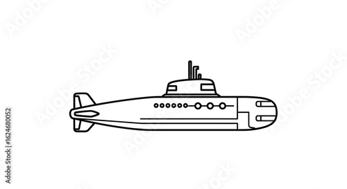 submarine, vessel, underwater, sea, ocean, ship, boat, transport, travel, marin, military, exploration, technology, engineering, design, illustration, outline, drawing, black, white, monochrome, vector, graphic, art, symbol, icon, hull, propeller, fin, periscope, communication, navigation, research, warfare, defense, stealth, modern, simple, flat, isolated, concept, structure, shape, line art, half face, horizontal