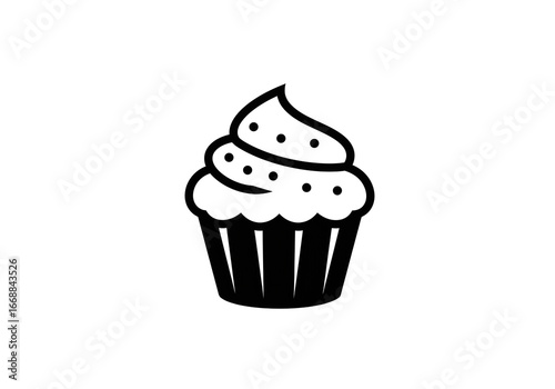 Simple black cupcake icon with swirls of frosting and dots for sprinkles on a white background