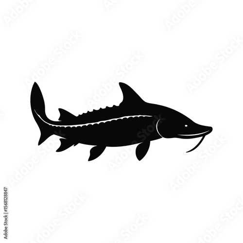 sturgeon, fish, silhouette, animal, aquatic, vector, illustration, isolated, background, nature, wildlife, sea, river, water, ocean, marin, black, white, outline, graphic, drawing, design, icon, symbol, clip art, image, art, simple, minimalist, logotype, mascot, species, endangered, caviar