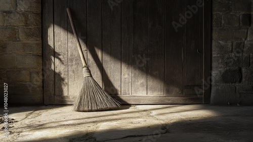 Simple Broom Leaning Against Wooden Door