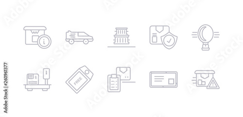 simple gray 10 vector icons set such as delivery warning, air mail, delivery list, delivery tag, weighing, hot air balloon, logistic protection. editable vector icon pack