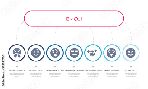 simple illustration set of 7 vector blue icons such as excited emoji, exhausted emoji, exploding head emoji, _icon4, frowning with open mouth grinning hand over mouth infographic design with 7 icons