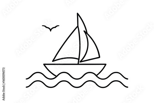 simple, line, drawing, of, a, sailboat, on, wave, with, boat, sailing, sea, water, marin, peaceful, calm, serene, landscape, vector, art, illustration, design, graphic, scene, beautiful, horizon, adventure