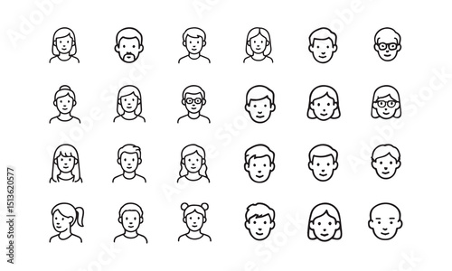 icon, people, face, profile, line art, minimalist, black-and-white, vector, illustration, design element, graphic, symbol, collection, set, diverse, woman, man, young, adult, outline, simple, flat, head shot, character, communication, team, group, community, drawing, style, vignetting, monochrome