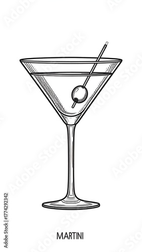 martini, drink, cocktail, glasses, olive, stem, alcohol, beverage, liqueur, bar, clear, liquid, vignetting, illustration, outline, elegant, celebration, party, graphic, drawing