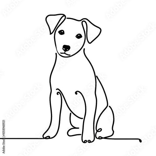 Simple one-line drawing of a sitting puppy in minimal black and white style, ideal for elegant and modern art pieces