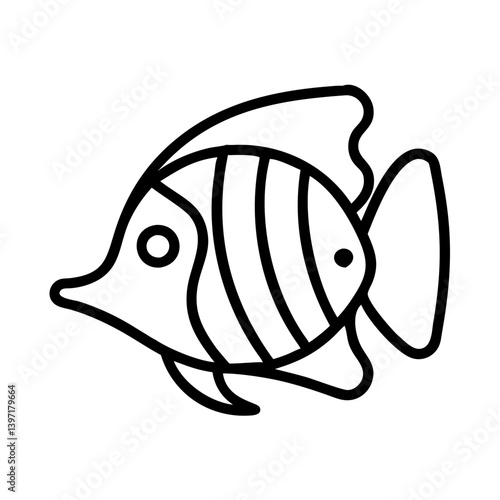 fish, tropical, outline, drawing, sea, ocean, aquatic, animal, marin, striped, fin, tail, eye, cute, simple, illustration, vector, icon, symbol, design, art, clip art, graphic, black, white, isolated, line, artwork, nature, underwater, creature, colouring, book, logotype, pet, aquarium, water, element, shape, artistic, minimalist, cartoon, seafood, wildlife, tropical fish, with