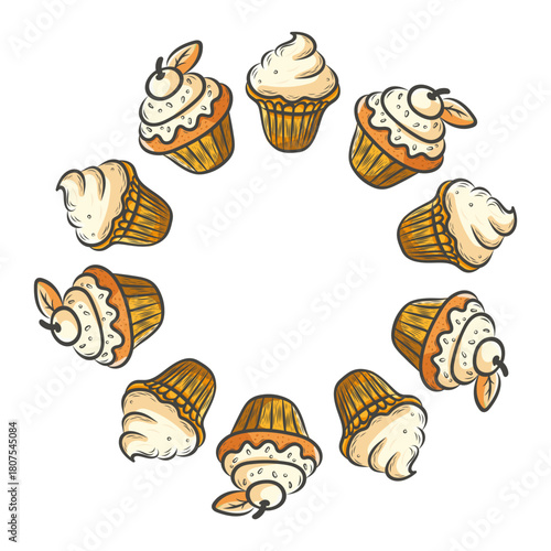 Simple pastries, cupcakes, buns, cakes with round frame with cream. Simple vector design perfect for holiday greetings, bakery.