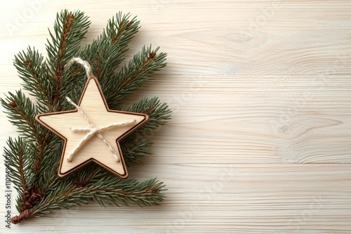 Simple pine branch on a light wooden surface with a minimalist wooden star