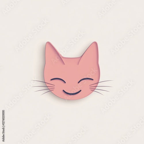 Simple Pink Cartoon Cat Face with Smiling Expression and Long Black Whiskers on Beige Background