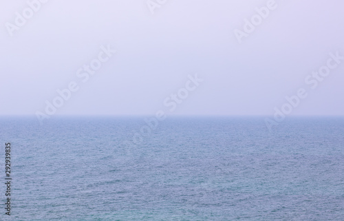 simple scenery landscape peaceful wallpaper sea foggy horizon view with smooth water foreground and gray sky background with empty copy space for text