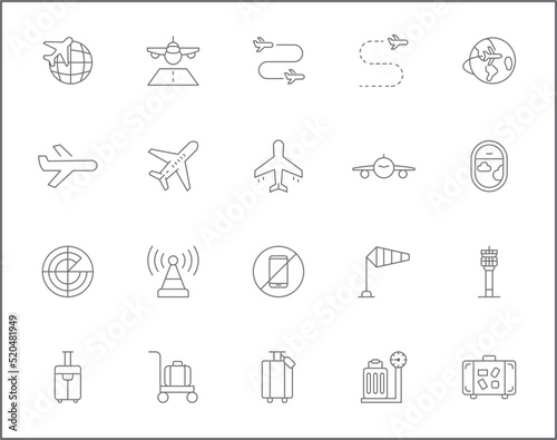 Simple Set of airport Related Vector Line Icons. Contains such Icons as flight, runway, tower, landing, travel, baggage, arrival, tourism and more.