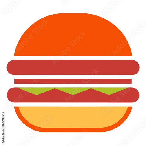 hamburger, burger, food, icon, illustration, fast food, sandwich, junk food, meat, bun, lettuce, red, orange, yellow, green, simple, minimalist, graphic, design, clip art, vector, drawing, eatery, cookery, snack, meal, take-away