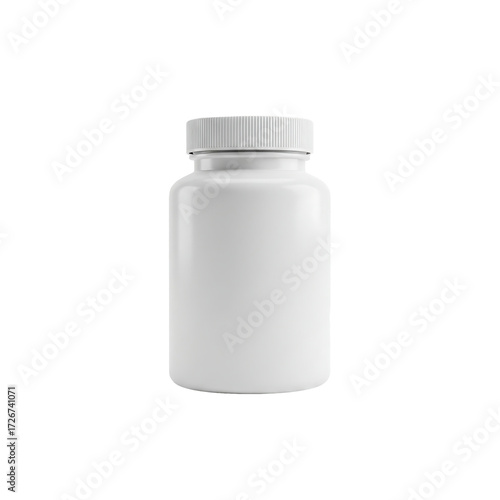 Simple white opaque plastic pill bottle with white screw-on cap isolated on a neutral background