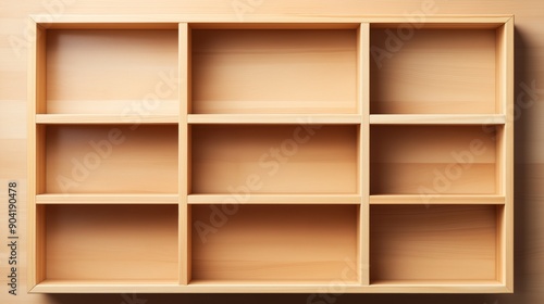 Simple wooden shelf display with nine compartments, suitable for organizing various items, 3d illustration.