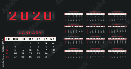 Simple yearly calendar 2020 design on black background with red text. Week starts on Sunday. Basic grid layout. Modern template for business planner, organizer, printing