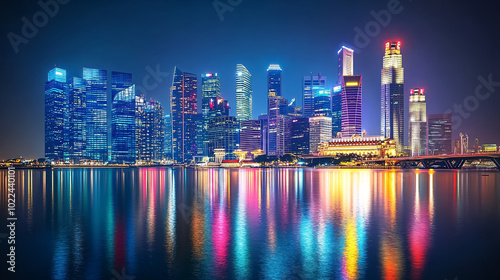 Singapore city skyline with modern skyscraper architecture for the concept of financial business and travel in Asia cityscape urban landmark, Marina Bay at night, dusk sky.