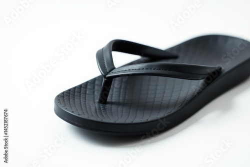 Single black flip-flop on white background, close-up , casual, footwear, photography