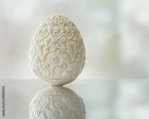 Single ceramic Easter egg on a mirrored surface, reflecting elegance and craftsmanship.
