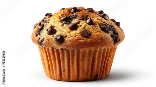 Single chocolate chip muffin, golden baked dessert, sweet treat, isolated on white background
