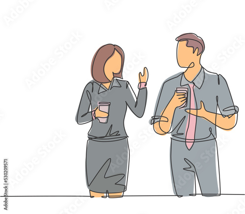 Single continuous line drawing of two young male and female worker holding paper cup drink and chatting during office break. Rest break at work concept one line draw design graphic vector illustration
