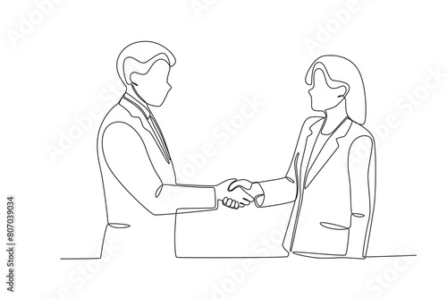 Single continuous line drawing of young Coworkers shaking hands. Business agreement celebration concept continuous line graphic draw design vector illustration