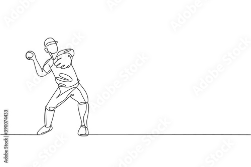Single continuous line drawing young agile man baseball player practice to throw the ball. Sport exercise concept. Trendy one line draw design graphic vector illustration for baseball promotion media