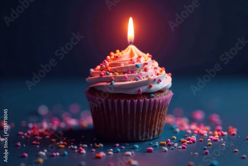 Single cupcake, vibrant sprinkles, glowing candle, dramatic shadow, cake, sweet