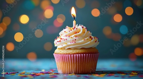 Single cupcake with white frosting and colorful sprinkles topped with a lit candle surrounded by scattered confetti on a table with bokeh light background creating a festive and celebratory mood