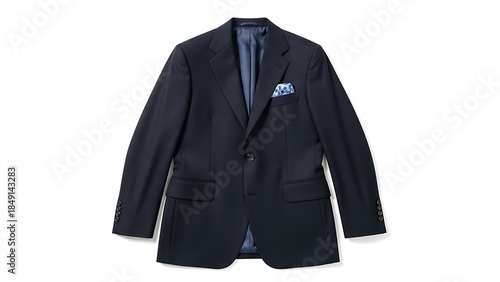Single Dark Navy Blue Men's Suit Jacket with Blue Patterned Pocket Square on White Background navy blue jacket