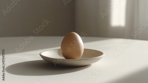egg, bowl, ceramic, single, light, shadow, table, minimal, simple, clean, white, beige, brown, natural, sunlight, interior, still, life, composition, object, design, home, decor, kitchen, food, breakfast, rustic, texture, grain, pale, neutral, calm, serene, peaceful, quiet, smooth, round, oval, delicate, art, photo, image, visual
