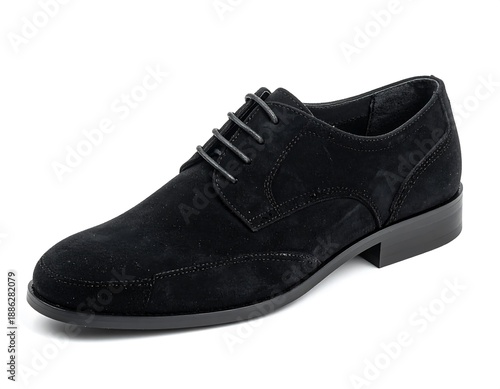 Single, elegant black suede dress shoe with laces, showcasing a simple heel and clean design against a white backdrop