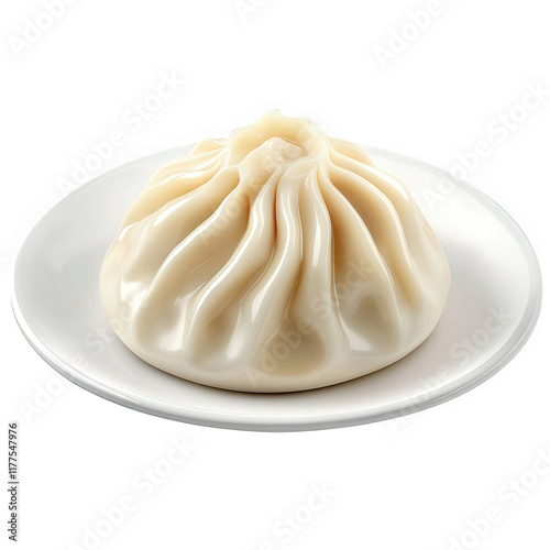 single. glossy dumpling displayed on a white plate the dumpling has a smooth. rounded shape with pleated edges. suggesting a soft and delicate texture it is likely a type of steamed bun. commonly enjo