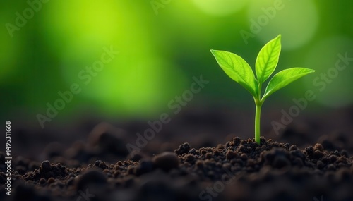 Single green seedling in fertile dark soil, blurred background , spring, stem
