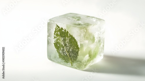 Single ice cube with green mint leaf frozen inside, placed on a white background with soft lighting.